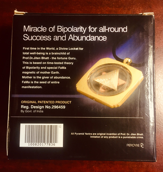 Divine Locket: First time in the world, a Devine Locate for total well-being. This is based on time tested therapy of Bipolarity. Its a locket with miracle of Bipolarity for all-round success. Bipolarity is the seed of entire manifestation. Size of pendent: 2in x 2in For free Vastu review and recommendation for existing home and business building please call Deepak Bakshi – 641.469.6307